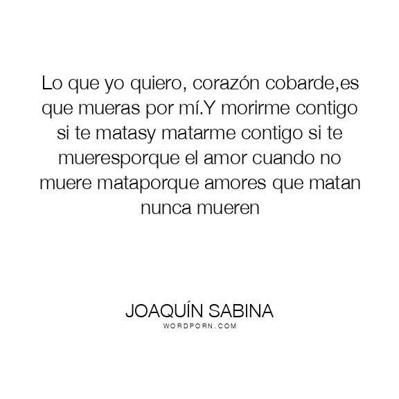Lo que yo quiero, corazón cobarde,es que mueras por mí.Y morirme contigo si te matasy matarme contigo si te mueresporque el amor cuando no muere mataporque amores que matan nunca mueren