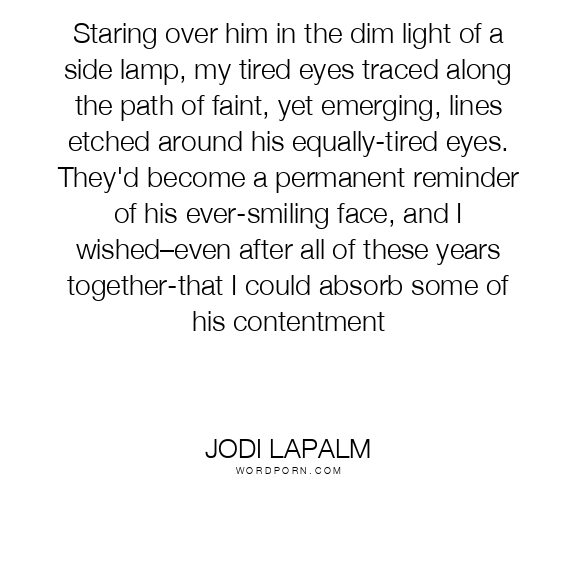 Staring over him in the dim light of a side lamp, my tired eyes traced along the path of faint, yet emerging, lines etched around his equally-tired eyes. They'd become a permanent reminder of his ever-smiling face, and I wished–even after all of these years together-that I could absorb some of his contentment