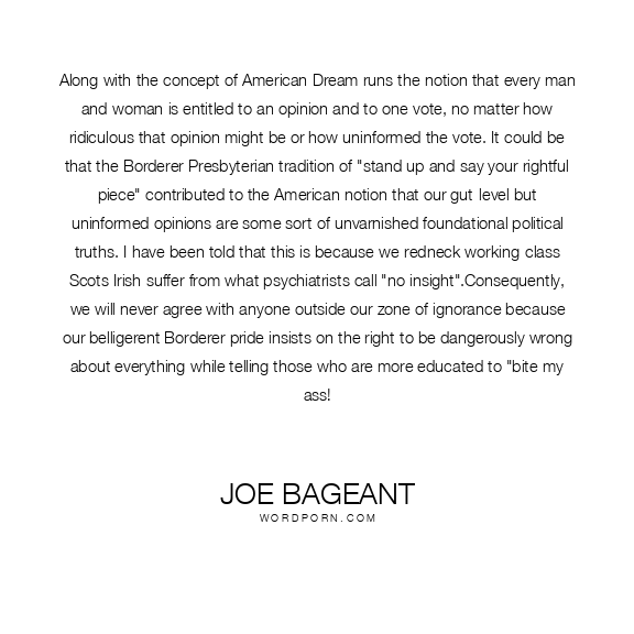 Along with the concept of American Dream runs the notion that every man and woman is entitled to an opinion and to one vote, no matter how ridiculous that opinion might be or how uninformed the vote. It could be that the Borderer Presbyterian tradition of "stand up and say your rightful piece" contributed to the American notion that our gut-level but uninformed opinions are some sort of unvarnished foundational political truths. I have been told that this is because we redneck working-class Scots Irish suffer from what psychiatrists call "no insight".Consequently, we will never agree with anyone outside our zone of ignorance because our belligerent Borderer pride insists on the right to be dangerously wrong about everything while telling those who are more educated to "bite my ass!