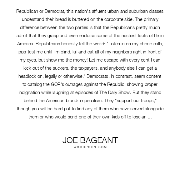 Republican or Democrat, this nation's affluent urban and suburban classes understand their bread is buttered on the corporate side. The primary difference between the two parties is that the Republicans pretty much admit that they grasp and even endorse some of the nastiest facts of life in America. Republicans honestly tell the world: "Listen in on my phone calls, piss-test me until I'm blind, kill and eat all of my neighbors right in front of my eyes, but show me the money! Let me escape with every cent I can kick out of the suckers, the taxpayers, and anybody else I can get a headlock on, legally or otherwise." Democrats, in contrast, seem content to catalog the GOP's outrages against the Republic, showing proper indignation while laughing at episodes of The Daily Show. But they stand behind the American brand: imperialism. They "support our troops," though you will be hard put to find any of them who have served alongside them or who would send one of their own kids off to lose an eye or an arm in Iraq. They play the imperial game, maintain their credit ratings, and plan to keep the beach house and the retirement investments if it means sacrificing every damned Lynndie England in West Virginia