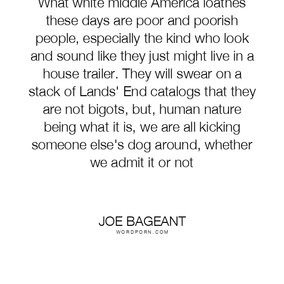 What white middle America loathes these days are poor and poorish people, especially the kind who look and sound like they just might live in a house trailer. They will swear on a stack of Lands' End catalogs that they are not bigots, but, human nature being what it is, we are all kicking someone else's dog around, whether we admit it or not