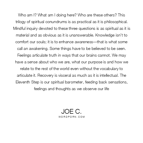Who am I? What am I doing here? Who are these others? This trilogy of spiritual conundrums is as practical as it is philosophical. Mindful inquiry devoted to these three questions is as spiritual as it is material and as obvious as it is unanswerable. Knowledge isn’t to comfort our souls; it is to enhance awareness—that is what some call an awakening. Some things have to be believed to be seen. Feelings articulate truth in ways that our brains cannot. We may have a sense about who we are, what our purpose is and how we relate to the rest of the world even without the vocabulary to articulate it. Recovery is visceral as much as it is intellectual. The Eleventh Step is our spiritual barometer, feeding back sensations, feelings and thoughts as we observe our life