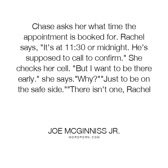 Chase asks her what time the appointment is booked for. Rachel says, "It's at 11:30 or midnight. He's supposed to call to confirm." She checks her cell. "But I want to be there early." she says."Why?""Just to be on the safe side.""There isn't one, Rachel
