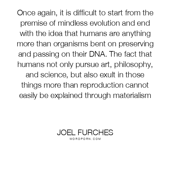 Once again, it is difficult to start from the premise of mindless evolution and end with the idea that humans are anything more than organisms bent on preserving and passing on their DNA. The fact that humans not only pursue art, philosophy, and science, but also exult in those things more than reproduction cannot easily be explained through materialism