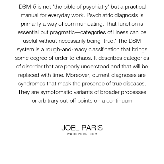 DSM-5 is not 'the bible of psychiatry' but a practical manual for everyday work. Psychiatric diagnosis is primarily a way of communicating. That function is essential but pragmatic—categories of illness can be useful without necessarily being 'true.' The DSM system is a rough-and-ready classification that brings some degree of order to chaos. It describes categories of disorder that are poorly understood and that will be replaced with time. Moreover, current diagnoses are syndromes that mask the presence of true diseases. They are symptomatic variants of broader processes or arbitrary cut-off points on a continuum