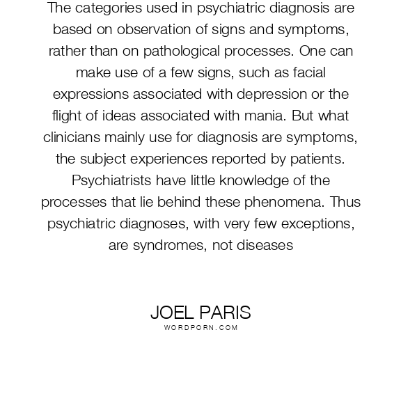 The categories used in psychiatric diagnosis are based on observation of signs and symptoms, rather than on pathological processes. One can make use of a few signs, such as facial expressions associated with depression or the flight of ideas associated with mania. But what clinicians mainly use for diagnosis are symptoms, the subject experiences reported by patients. Psychiatrists have little knowledge of the processes that lie behind these phenomena. Thus psychiatric diagnoses, with very few exceptions, are syndromes, not diseases