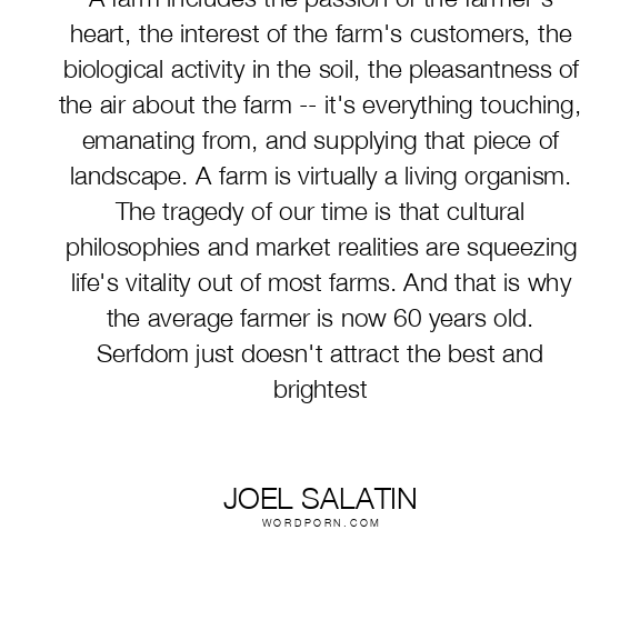 A farm includes the passion of the farmer's heart, the interest of the farm's customers, the biological activity in the soil, the pleasantness of the air about the farm -- it's everything touching, emanating from, and supplying that piece of landscape. A farm is virtually a living organism. The tragedy of our time is that cultural philosophies and market realities are squeezing life's vitality out of most farms. And that is why the average farmer is now 60 years old. Serfdom just doesn't attract the best and brightest