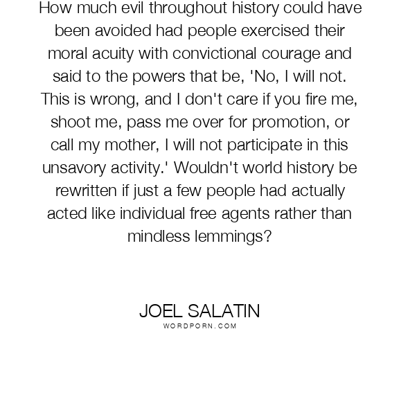 How much evil throughout history could have been avoided had people exercised their moral acuity with convictional courage and said to the powers that be, 'No, I will not. This is wrong, and I don't care if you fire me, shoot me, pass me over for promotion, or call my mother, I will not participate in this unsavory activity.' Wouldn't world history be rewritten if just a few people had actually acted like individual free agents rather than mindless lemmings?