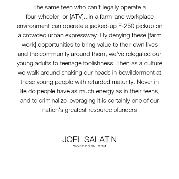 The same teen who can't legally operate a four-wheeler, or [ATV]...in a farm lane workplace environment can operate a jacked-up F-250 pickup on a crowded urban expressway. By denying these [farm work] opportunities to bring value to their own lives and the community around them, we've relegated our young adults to teenage foolishness. Then as a culture we walk around shaking our heads in bewilderment at these young people with retarded maturity. Never in life do people have as much energy as in their teens, and to criminalize leveraging it is certainly one of our nation's greatest resource blunders
