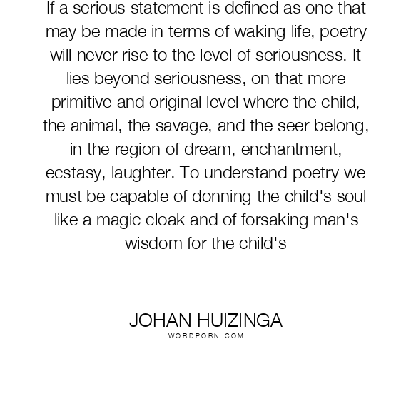 If a serious statement is defined as one that may be made in terms of waking life, poetry will never rise to the level of seriousness. It lies beyond seriousness, on that more primitive and original level where the child, the animal, the savage, and the seer belong, in the region of dream, enchantment, ecstasy, laughter. To understand poetry we must be capable of donning the child's soul like a magic cloak and of forsaking man's wisdom for the child's