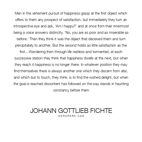 Men in the vehement pursuit of happiness grasp at the first object which offers to them any prospect of satisfaction, but immediately they turn an introspective eye and ask, ‘Am I happy?’ and at once from their innermost being a voice answers distinctly, ‘No, you are as poor and as miserable as before.' Then they think it was the object that deceived them and turn precipitately to another. But the second holds as little satisfaction as the first…Wandering then through life restless and tormented, at each successive station they think that happiness dwells at the next, but when they reach it happiness is no longer there. In whatever position they may find themselves there is always another one which they discern from afar, and which but to touch, they think, is to find the wished delight, but when the goal is reached discontent has followed on the way stands in haunting constancy before them