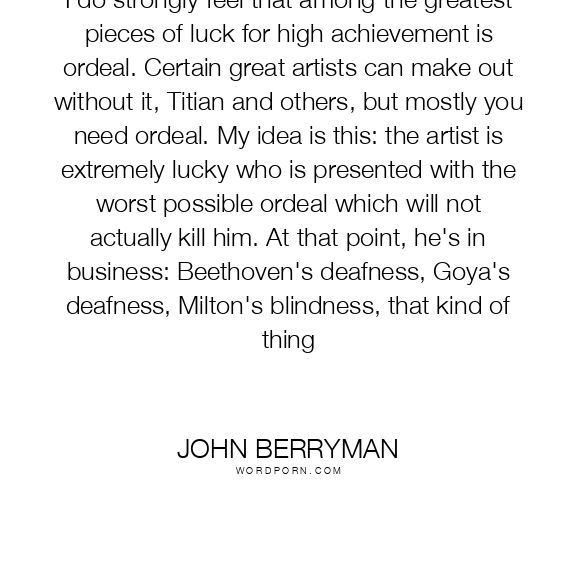 I do strongly feel that among the greatest pieces of luck for high achievement is ordeal. Certain great artists can make out without it, Titian and others, but mostly you need ordeal. My idea is this: the artist is extremely lucky who is presented with the worst possible ordeal which will not actually kill him. At that point, he's in business: Beethoven's deafness, Goya's deafness, Milton's blindness, that kind of thing