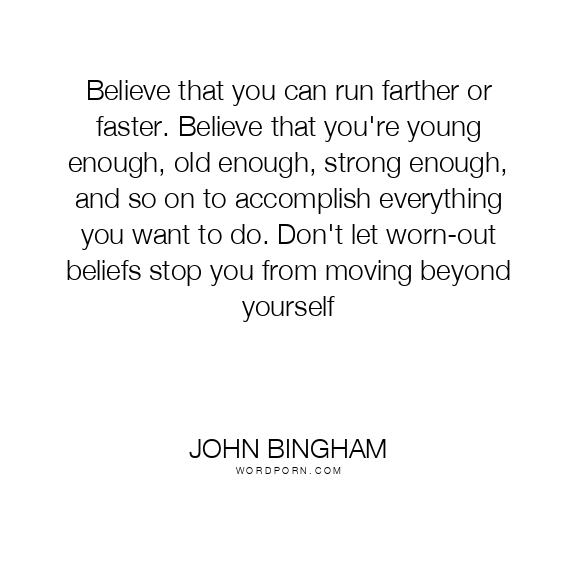 Believe that you can run farther or faster. Believe that you're young enough, old enough, strong enough, and so on to accomplish everything you want to do. Don't let worn-out beliefs stop you from moving beyond yourself