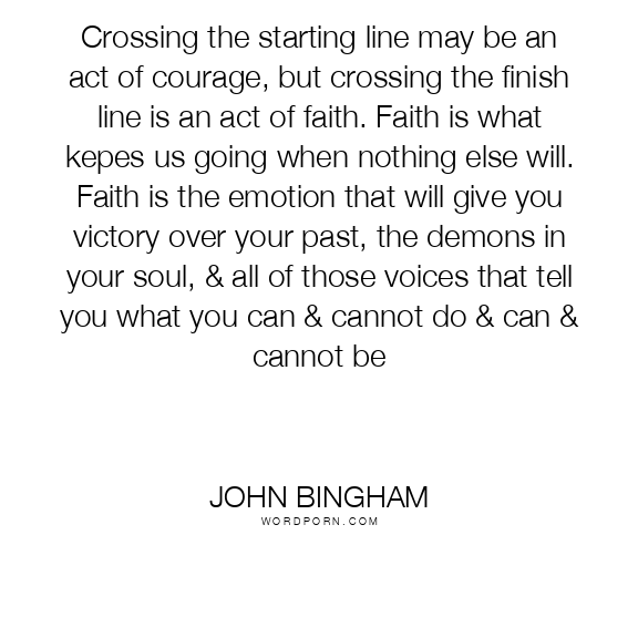 Crossing the starting line may be an act of courage, but crossing the finish line is an act of faith. Faith is what kepes us going when nothing else will. Faith is the emotion that will give you victory over your past, the demons in your soul, & all of those voices that tell you what you can & cannot do & can & cannot be
