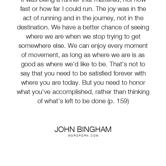 It was being a runner that mattered, not how fast or how far I could run. The joy was in the act of running and in the journey, not in the destination. We have a better chance of seeing where we are when we stop trying to get somewhere else. We can enjoy every moment of movement, as long as where we are is as good as where we'd like to be. That's not to say that you need to be satisfied forever with where you are today. But you need to honor what you've accomplished, rather than thinking of what's left to be done (p. 159)