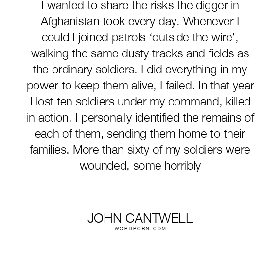 I wanted to share the risks the digger in Afghanistan took every day. Whenever I could I joined patrols ‘outside the wire’, walking the same dusty tracks and fields as the ordinary soldiers. I did everything in my power to keep them alive, I failed. In that year I lost ten soldiers under my command, killed in action. I personally identified the remains of each of them, sending them home to their families. More than sixty of my soldiers were wounded, some horribly