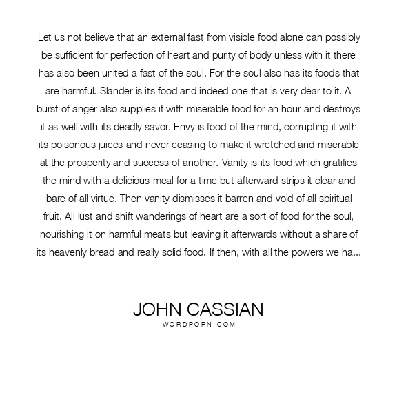 Let us not believe that an external fast from visible food alone can possibly be sufficient for perfection of heart and purity of body unless with it there has also been united a fast of the soul. For the soul also has its foods that are harmful. Slander is its food and indeed one that is very dear to it. A burst of anger also supplies it with miserable food for an hour and destroys it as well with its deadly savor. Envy is food of the mind, corrupting it with its poisonous juices and never ceasing to make it wretched and miserable at the prosperity and success of another. Vanity is its food which gratifies the mind with a delicious meal for a time but afterward strips it clear and bare of all virtue. Then vanity dismisses it barren and void of all spiritual fruit. All lust and shift wanderings of heart are a sort of food for the soul, nourishing it on harmful meats but leaving it afterwards without a share of its heavenly bread and really solid food. If then, with all the powers we have, we abstain from these in a most holy fast our observance of the bodily fast will be both useful and profitable