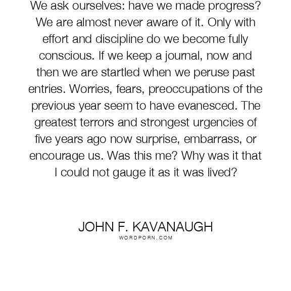 We ask ourselves: have we made progress? We are almost never aware of it. Only with effort and discipline do we become fully conscious. If we keep a journal, now and then we are startled when we peruse past entries. Worries, fears, preoccupations of the previous year seem to have evanesced. The greatest terrors and strongest urgencies of five years ago now surprise, embarrass, or encourage us. Was this me? Why was it that I could not gauge it as it was lived?