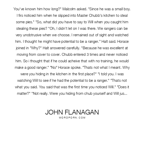 You've known him how long?" Malcolm asked. "Since he was a small boy. I firs noticed him when he slipped into Master Chubb's kitchen to steal some pies." "So, what did you have to say to Will when you caught him stealing these pies? "Oh, I didn't let on I was there. We rangers can be very unobtrusive when we choose. I remained out of sight and watched him. I thought he might have potential to be a ranger." Halt said. Horace joined in "Why?" Halt answered carefully. "Because he was excellent at moving from cover to cover. Chubb entered 3 times and never noticed him. So i thought that if he could acheive that with no training, he would make a good ranger." "No" Horace spoke. "Thats not what I meant. Why were you hiding in the kitchen in the first place?" "I told you. I was watching Will to see if he had the potential to be a ranger." "Thats not what you said. You said that was the first time you noticed Will." "Does it matter?" "Not really. Were you hiding from chub yourself and Will just turned up by coincidence?" "And why would I be hiding from master Chubb in his own kitchen?" "Well, there were freshly made pies on the windowsill, and you like pies, don't you?" "Are you acusing me of trying to steal those pies?!?!" "No, of course not. I just thought i'd give you the opportunity to confess." After a pause, Halt continued. "You know, Horace, you used to be a most agreeable young man. Whatever happened to you?" "I've spent to much time around you, I suppose." And Halt had to admit that was probably true
