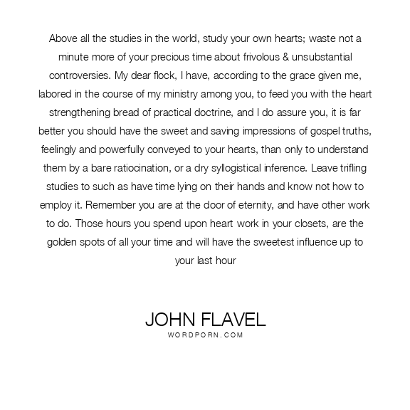 Above all the studies in the world, study your own hearts; waste not a minute more of your precious time about frivolous & unsubstantial controversies. My dear flock, I have, according to the grace given me, labored in the course of my ministry among you, to feed you with the heart strengthening bread of practical doctrine, and I do assure you, it is far better you should have the sweet and saving impressions of gospel truths, feelingly and powerfully conveyed to your hearts, than only to understand them by a bare ratiocination, or a dry syllogistical inference. Leave trifling studies to such as have time lying on their hands and know not how to employ it. Remember you are at the door of eternity, and have other work to do. Those hours you spend upon heart-work in your closets, are the golden spots of all your time and will have the sweetest influence up to your last hour