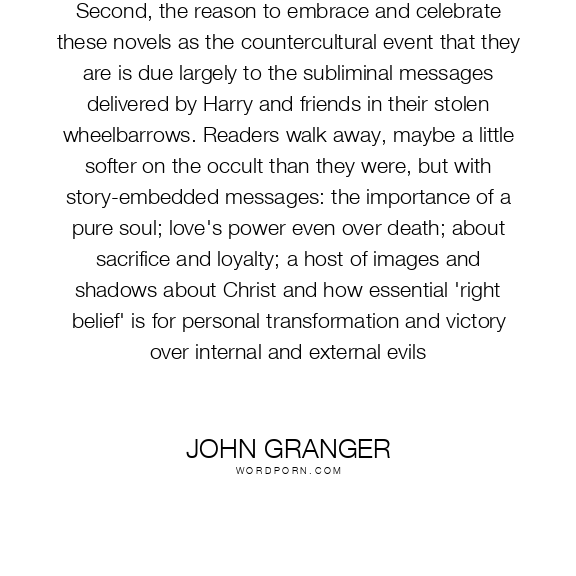 Second, the reason to embrace and celebrate these novels as the countercultural event that they are is due largely to the subliminal messages delivered by Harry and friends in their stolen wheelbarrows. Readers walk away, maybe a little softer on the occult than they were, but with story-embedded messages: the importance of a pure soul; love's power even over death; about sacrifice and loyalty; a host of images and shadows about Christ and how essential 'right belief' is for personal transformation and victory over internal and external evils