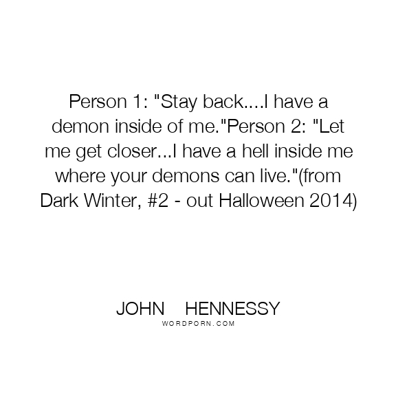 Person 1: "Stay back....I have a demon inside of me."Person 2: "Let me get closer...I have a hell inside me where your demons can live."(from Dark Winter, #2 - out Halloween 2014)