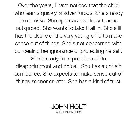 Over the years, I have noticed that the child who learns quickly is adventurous. She's ready to run risks. She approaches life with arms outspread. She wants to take it all in. She still has the desire of the very young child to make sense out of things. She's not concerned with concealing her ignorance or protecting herself. She's ready to expose herself to disappointment and defeat. She has a certain confidence. She expects to make sense out of things sooner or later. She has a kind of trust
