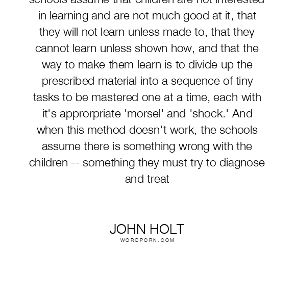 schools assume that children are not interested in learning and are not much good at it, that they will not learn unless made to, that they cannot learn unless shown how, and that the way to make them learn is to divide up the prescribed material into a sequence of tiny tasks to be mastered one at a time, each with it's approrpriate 'morsel' and 'shock.' And when this method doesn't work, the schools assume there is something wrong with the children -- something they must try to diagnose and treat