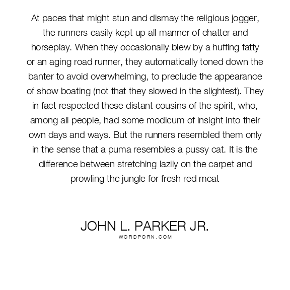 At paces that might stun and dismay the religious jogger, the runners easily kept up all manner of chatter and horseplay. When they occasionally blew by a huffing fatty or an aging road runner, they automatically toned down the banter to avoid overwhelming, to preclude the appearance of show boating (not that they slowed in the slightest). They in fact respected these distant cousins of the spirit, who, among all people, had some modicum of insight into their own days and ways. But the runners resembled them only in the sense that a puma resembles a pussy cat. It is the difference between stretching lazily on the carpet and prowling the jungle for fresh red meat