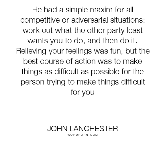 He had a simple maxim for all competitive or adversarial situations: work out what the other party least wants you to do, and then do it. Relieving your feelings was fun, but the best course of action was to make things as difficult as possible for the person trying to make things difficult for you