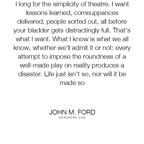 I long for the simplicity of theatre. I want lessons learned, comeuppances delivered, people sorted out, all before your bladder gets distractingly full. That's what I want. What I know is what we all know, whether we'll admit it or not: every attempt to impose the roundness of a well-made play on reality produces a disaster. Life just isn't so, nor will it be made so
