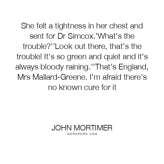 She felt a tightness in her chest and sent for Dr Simcox.'What's the trouble?''Look out there, that's the trouble! It's so green and quiet and it's always bloody raining.''That's England, Mrs Mallard-Greene. I'm afraid there's no known cure for it