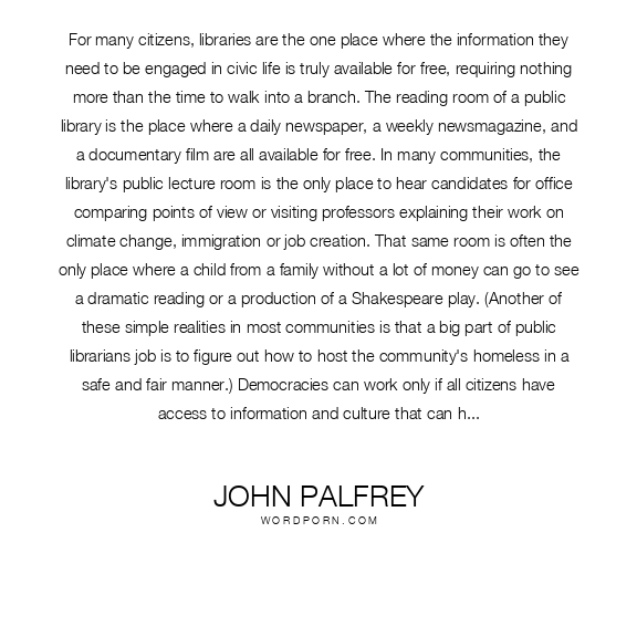 For many citizens, libraries are the one place where the information they need to be engaged in civic life is truly available for free, requiring nothing more than the time to walk into a branch. The reading room of a public library is the place where a daily newspaper, a weekly newsmagazine, and a documentary film are all available for free. In many communities, the library's public lecture room is the only place to hear candidates for office comparing points of view or visiting professors explaining their work on climate change, immigration or job creation. That same room is often the only place where a child from a family without a lot of money can go to see a dramatic reading or a production of a Shakespeare play. (Another of these simple realities in most communities is that a big part of public librarians job is to figure out how to host the community's homeless in a safe and fair manner.) Democracies can work only if all citizens have access to information and culture that can help them make good choices, whether at the voting booth or in other aspects of public life