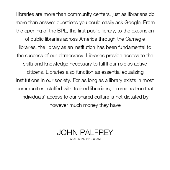 Libraries are more than community centers, just as librarians do more than answer questions you could easily ask Google. From the opening of the BPL, the first public library, to the expansion of public libraries across America through the Carnegie libraries, the library as an institution has been fundamental to the success of our democracy. Libraries provide access to the skills and knowledge necessary to fulfill our role as active citizens. Libraries also function as essential equalizing institutions in our society. For as long as a library exists in most communities, staffed with trained librarians, it remains true that individuals' access to our shared culture is not dictated by however much money they have