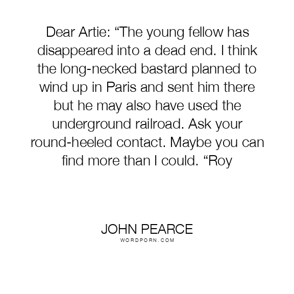 Dear Artie: “The young fellow has disappeared into a dead end. I think the long-necked bastard planned to wind up in Paris and sent him there but he may also have used the underground railroad. Ask your round-heeled contact. Maybe you can find more than I could. “Roy