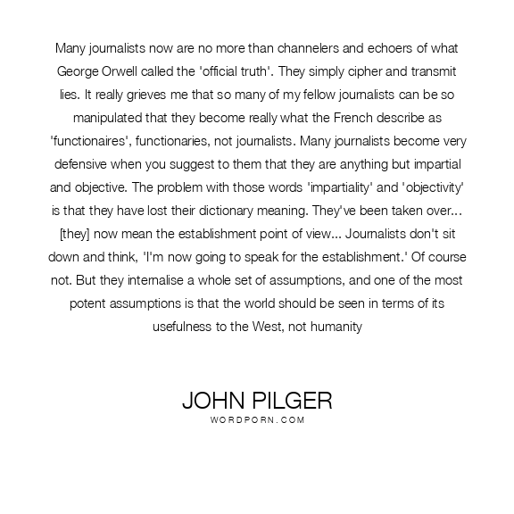 Many journalists now are no more than channelers and echoers of what George Orwell called the 'official truth'. They simply cipher and transmit lies. It really grieves me that so many of my fellow journalists can be so manipulated that they become really what the French describe as 'functionaires', functionaries, not journalists. Many journalists become very defensive when you suggest to them that they are anything but impartial and objective. The problem with those words 'impartiality' and 'objectivity' is that they have lost their dictionary meaning. They've been taken over... [they] now mean the establishment point of view... Journalists don't sit down and think, 'I'm now going to speak for the establishment.' Of course not. But they internalise a whole set of assumptions, and one of the most potent assumptions is that the world should be seen in terms of its usefulness to the West, not humanity