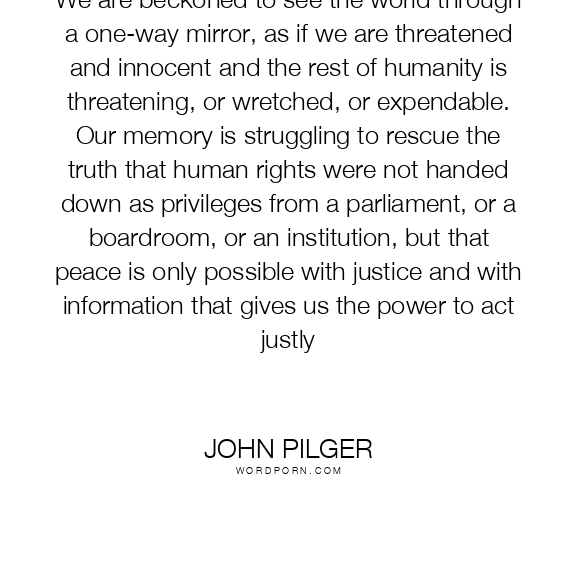 We are beckoned to see the world through a one-way mirror, as if we are threatened and innocent and the rest of humanity is threatening, or wretched, or expendable. Our memory is struggling to rescue the truth that human rights were not handed down as privileges from a parliament, or a boardroom, or an institution, but that peace is only possible with justice and with information that gives us the power to act justly