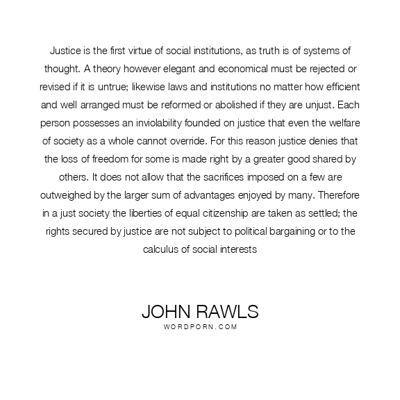 Justice is the first virtue of social institutions, as truth is of systems of thought. A theory however elegant and economical must be rejected or revised if it is untrue; likewise laws and institutions no matter how efficient and well-arranged must be reformed or abolished if they are unjust. Each person possesses an inviolability founded on justice that even the welfare of society as a whole cannot override. For this reason justice denies that the loss of freedom for some is made right by a greater good shared by others. It does not allow that the sacrifices imposed on a few are outweighed by the larger sum of advantages enjoyed by many. Therefore in a just society the liberties of equal citizenship are taken as settled; the rights secured by justice are not subject to political bargaining or to the calculus of social interests