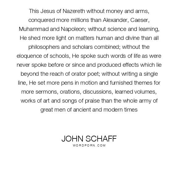 This Jesus of Nazereth without money and arms, conquered more millions than Alexander, Caeser, Muhammad and Napoleon; without science and learning, He shed more light on matters human and divine than all philosophers and scholars combined; without the eloquence of schools, He spoke such words of life as were never spoke before or since and produced effects which lie beyond the reach of orator poet; without writing a single line, He set more pens in motion and furnished themes for more sermons, orations, discussions, learned volumes, works of art and songs of praise than the whole army of great men of ancient and modern times