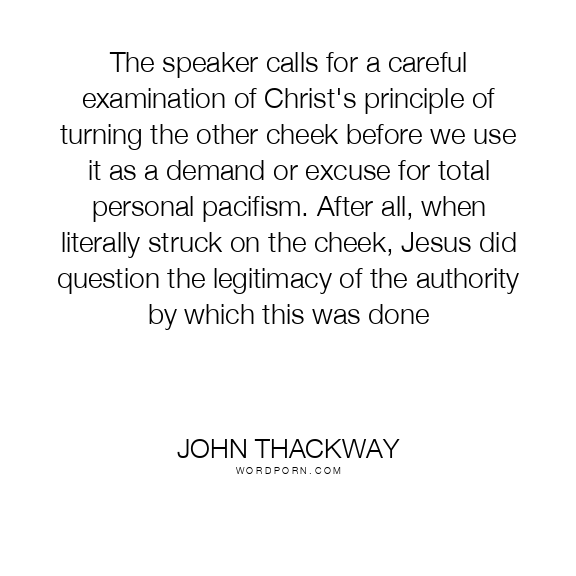 The speaker calls for a careful examination of Christ's principle of turning the other cheek before we use it as a demand or excuse for total personal pacifism. After all, when literally struck on the cheek, Jesus did question the legitimacy of the authority by which this was done