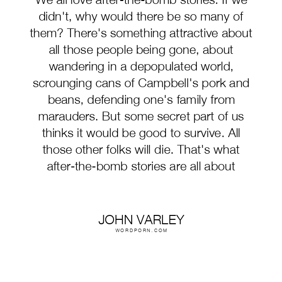 We all love after-the-bomb stories. If we didn't, why would there be so many of them? There's something attractive about all those people being gone, about wandering in a depopulated world, scrounging cans of Campbell's pork and beans, defending one's family from marauders. But some secret part of us thinks it would be good to survive. All those other folks will die. That's what after-the-bomb stories are all about