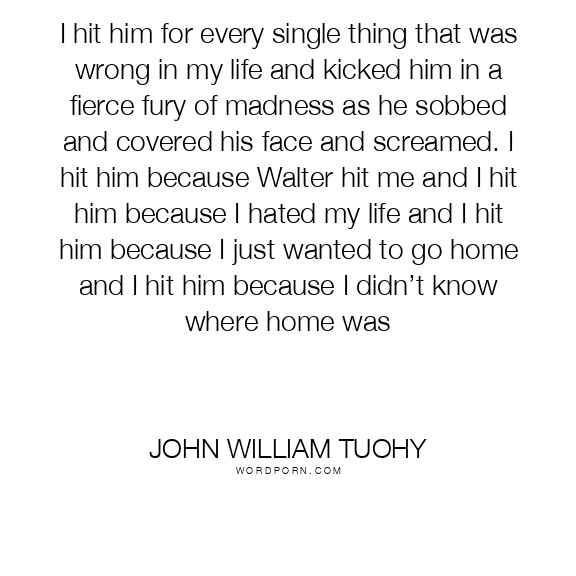 I hit him for every single thing that was wrong in my life and kicked him in a fierce fury of madness as he sobbed and covered his face and screamed. I hit him because Walter hit me and I hit him because I hated my life and I hit him because I just wanted to go home and I hit him because I didn’t know where home was