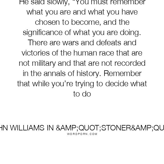 He said slowly, “You must remember what you are and what you have chosen to become, and the significance of what you are doing. There are wars and defeats and victories of the human race that are not military and that are not recorded in the annals of history. Remember that while you’re trying to decide what to do