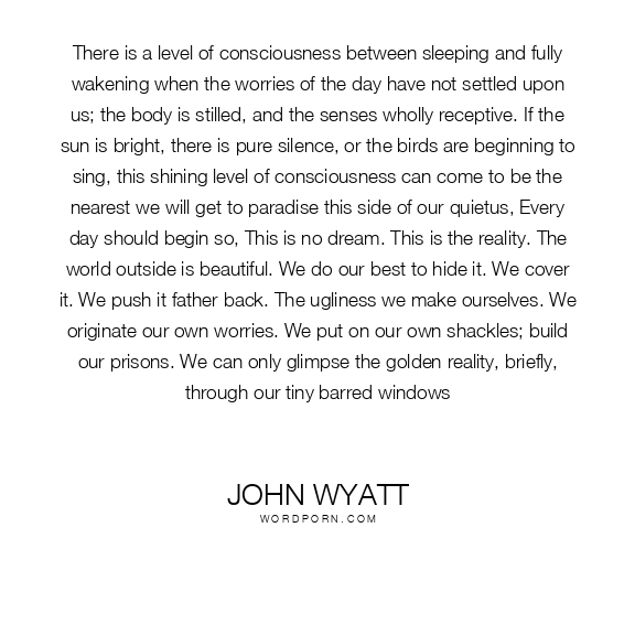 There is a level of consciousness between sleeping and fully wakening when the worries of the day have not settled upon us; the body is stilled, and the senses wholly receptive. If the sun is bright, there is pure silence, or the birds are beginning to sing, this shining level of consciousness can come to be the nearest we will get to paradise this side of our quietus, Every day should begin so, This is no dream. This is the reality. The world outside is beautiful. We do our best to hide it. We cover it. We push it father back. The ugliness we make ourselves. We originate our own worries. We put on our own shackles; build our prisons. We can only glimpse the golden reality, briefly, through our tiny barred windows