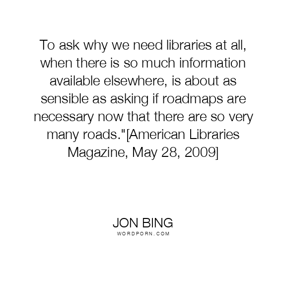 To ask why we need libraries at all, when there is so much information available elsewhere, is about as sensible as asking if roadmaps are necessary now that there are so very many roads."[American Libraries Magazine, May 28, 2009]
