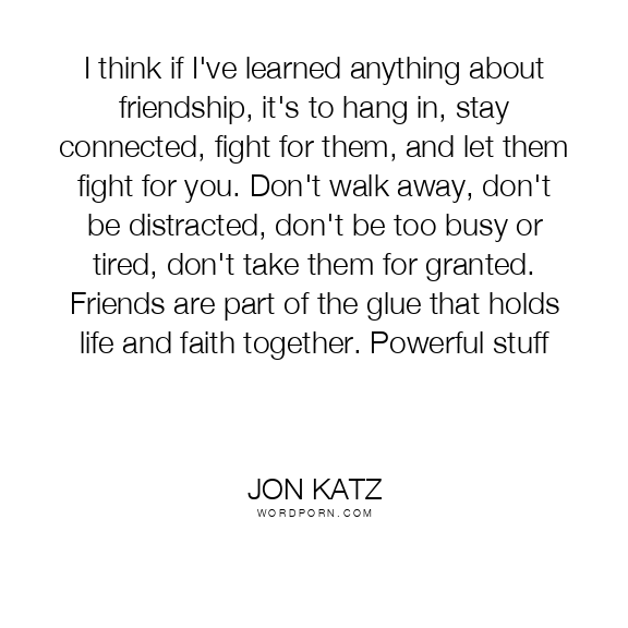 I think if I've learned anything about friendship, it's to hang in, stay connected, fight for them, and let them fight for you. Don't walk away, don't be distracted, don't be too busy or tired, don't take them for granted. Friends are part of the glue that holds life and faith together. Powerful stuff