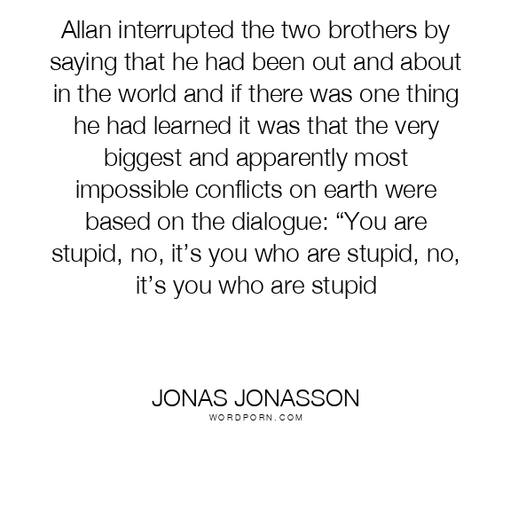 Jonas Jonasson quote. Allan interrupted the two brothers by saying that he had been out and about in the world and if there was one thing he had learned it was that the very biggest and apparently most impossible conflicts on earth were based on the dialogue: “You are stupid, no, it’s you who are stupid, no, it’s you who are stupid