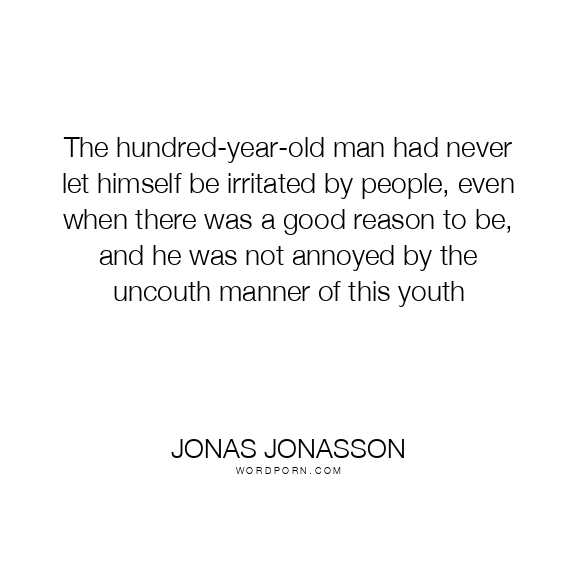 Jonas Jonasson quote. The hundred-year-old man had never let himself be irritated by people, even when there was a good reason to be, and he was not annoyed by the uncouth manner of this youth