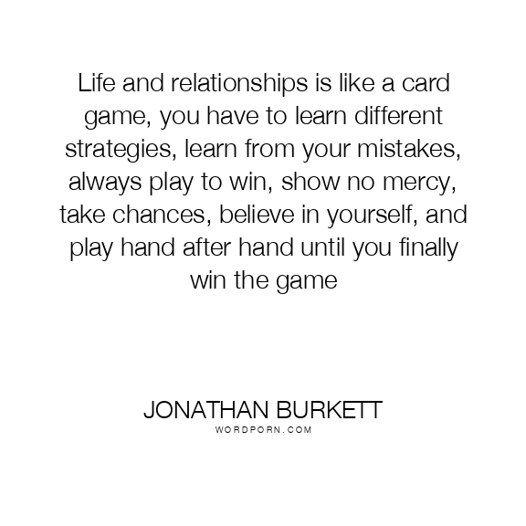 Life and relationships is like a card game, you have to learn different strategies, learn from your mistakes, always play to win, show no mercy, take chances, believe in yourself, and play hand after hand until you finally win the game