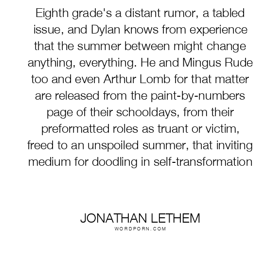 Eighth grade's a distant rumor, a tabled issue, and Dylan knows from experience that the summer between might change anything, everything. He and Mingus Rude too and even Arthur Lomb for that matter are released from the paint-by-numbers page of their schooldays, from their preformatted roles as truant or victim, freed to an unspoiled summer, that inviting medium for doodling in self-transformation